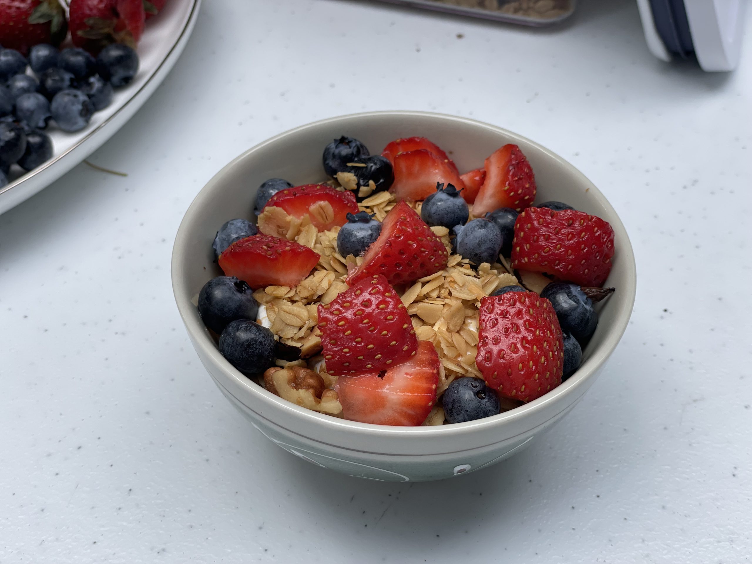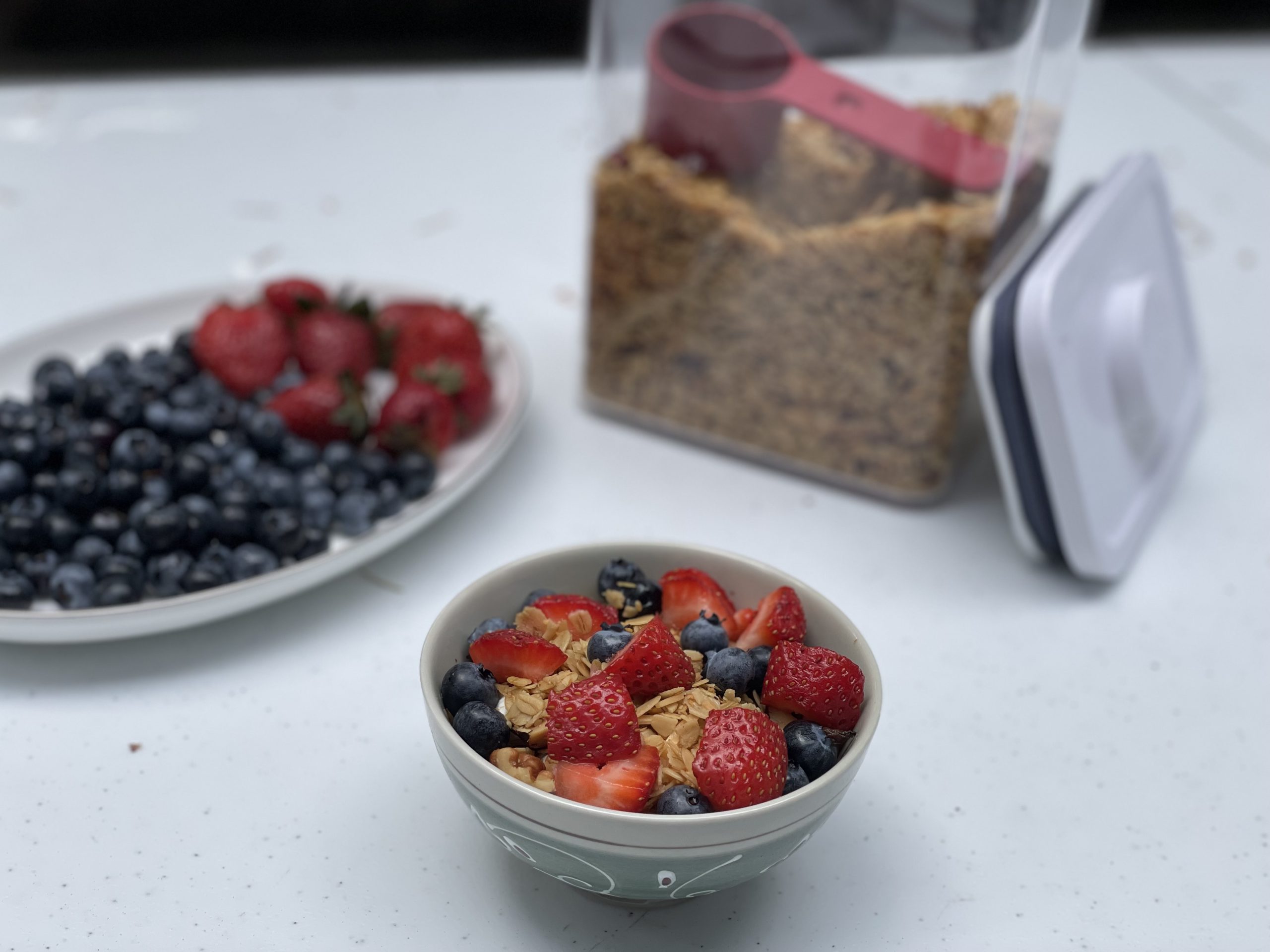 Questa granola e' diventata la mia colazione con una tazza di yogurt greco e dei frutti di bosco.