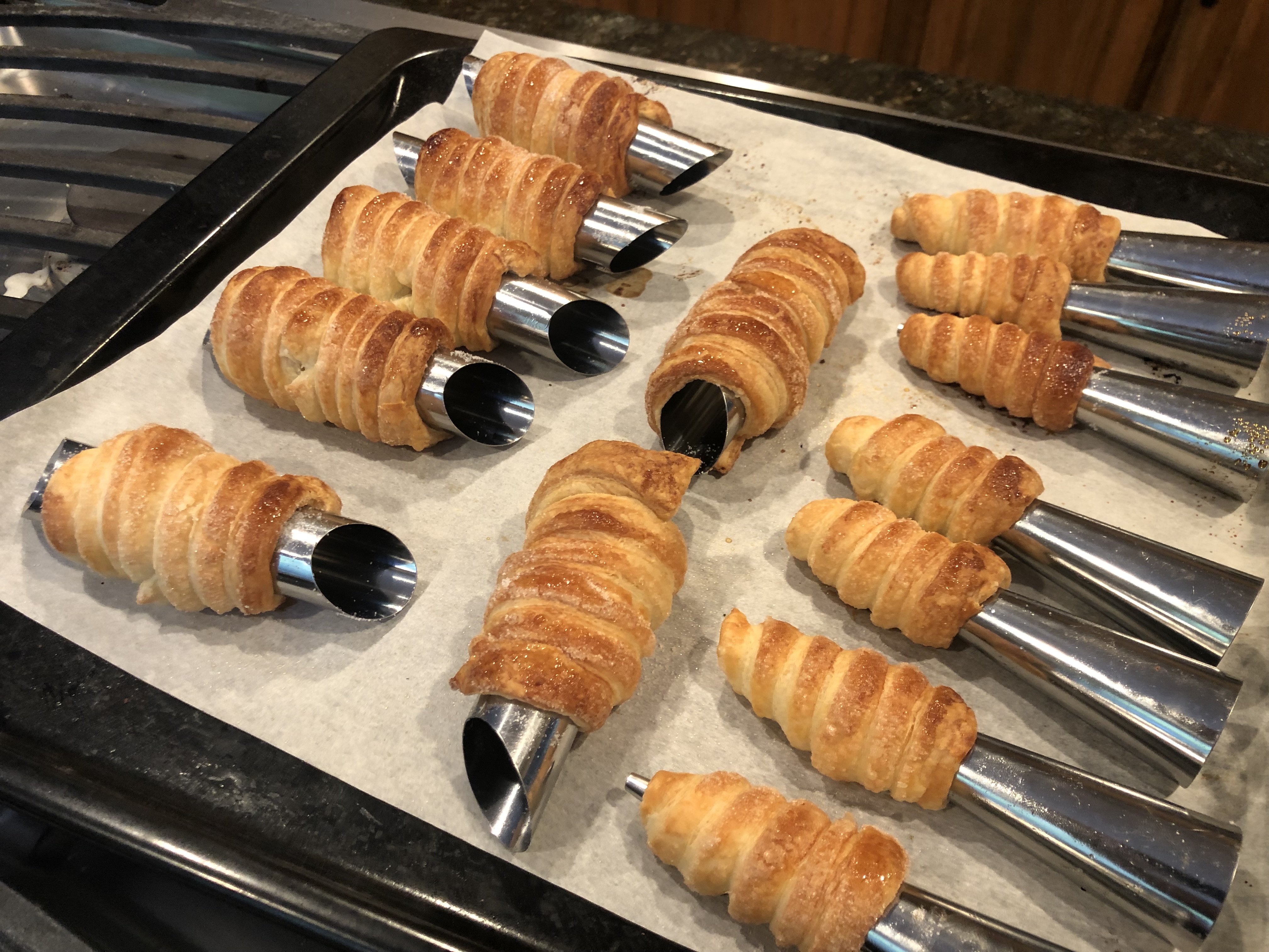 Cuocete i cannoncini in forno a 200C (400F) per circa 18-20 minuti. Quando sono pronti sfornateli e lasciateli raffreddare. Quando son ben freddi, sfilate il cilindretto, mettete la crema in un tasca da pasticcere e riempiteli.